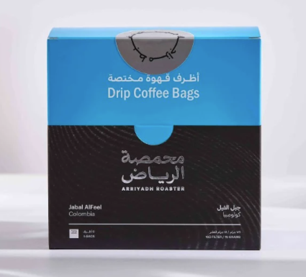 خمسة أظرف مميزة بتصميمها العملي، يحتوي كل منها على 15 جرام من قهوة (جبل الفيل) الكولومبية بإيحاءاتها المميزة بين حلاوة الشوكولاتة و الفواكة الحمراء و حموضة البرتقال والمكسرات.